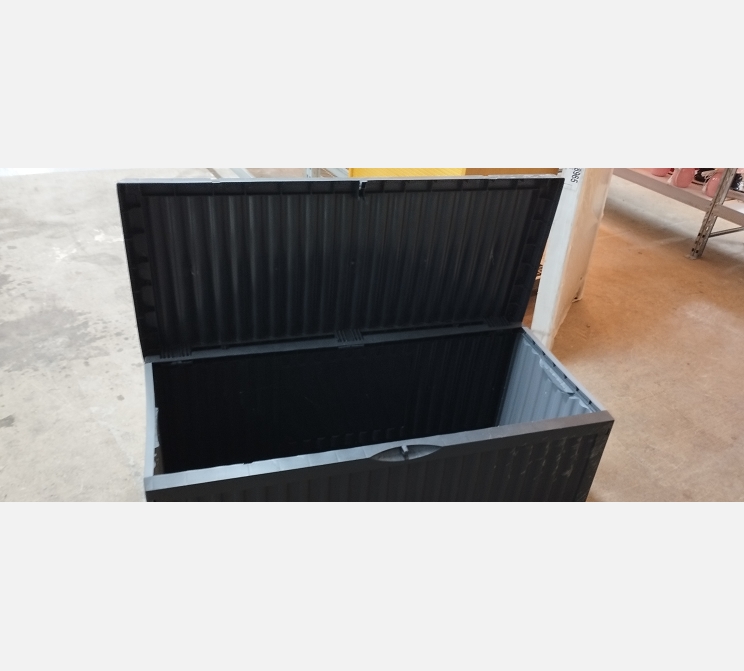 Coffre de jardin en plastique noir.