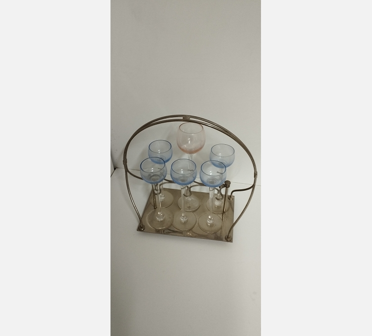 Service de 6 verres dans panier en métal argenté. 1 verre dépareillé