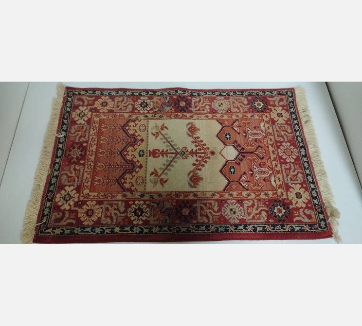 (12) Tapis oriental teinte orange et crème. 90/62 cm
