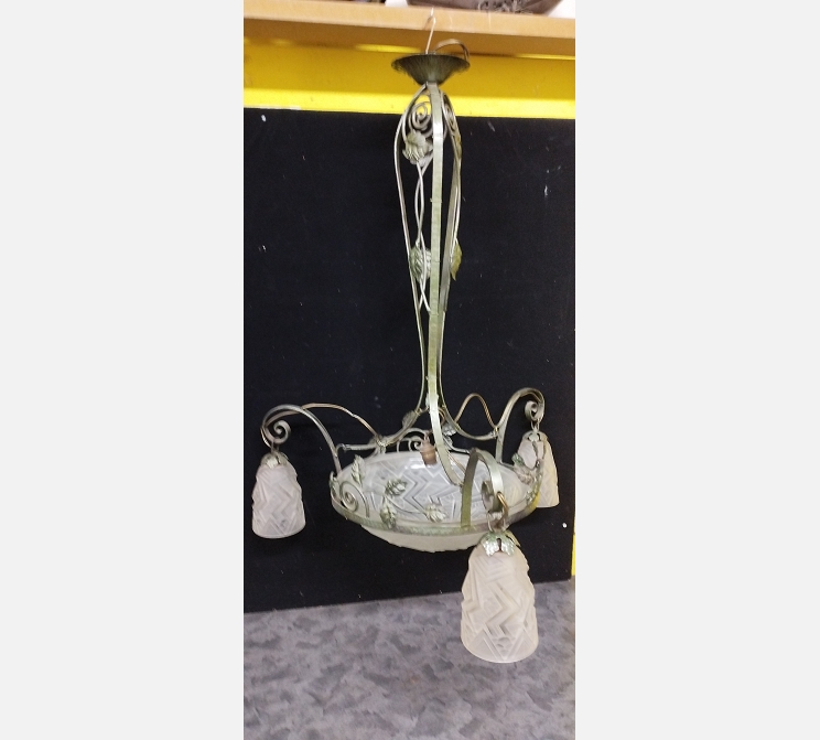 Suspension lustre style Art Nouveau en fer forgé et pâte de verre.