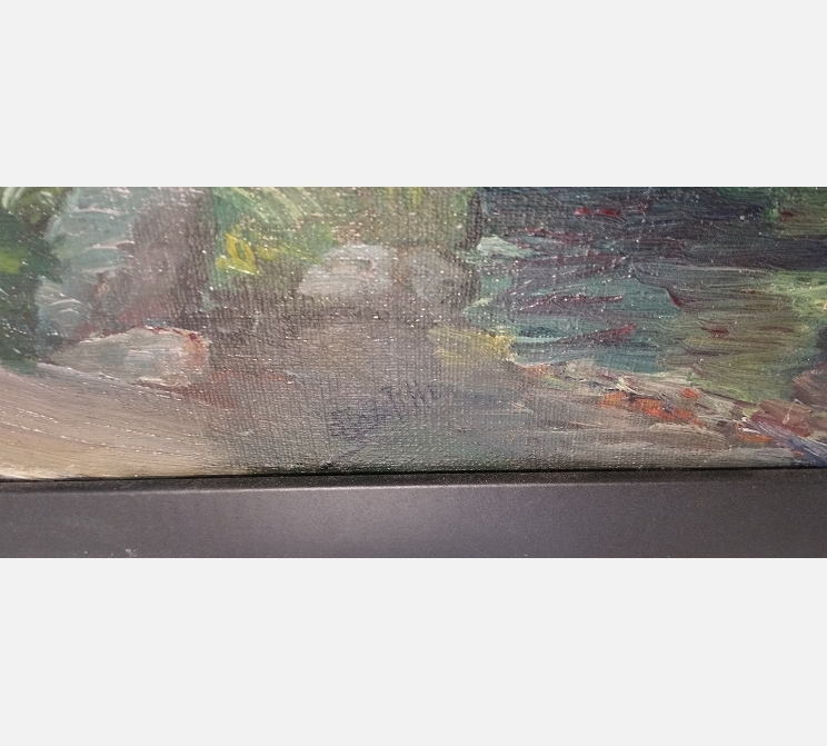 Grande peinture d'une chaumière au bout d'un chemin, signée.