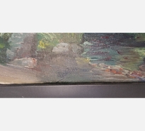 GRANDE PEINTURE D'UNE CHAUMIÈRE AU BOUT D'UN CHEMIN, SIGNÉE.