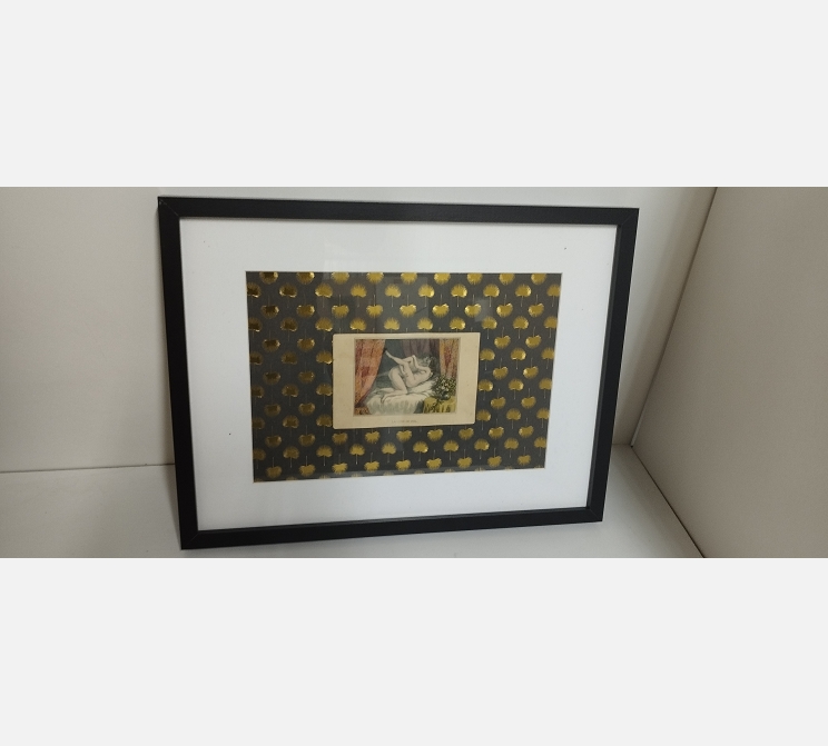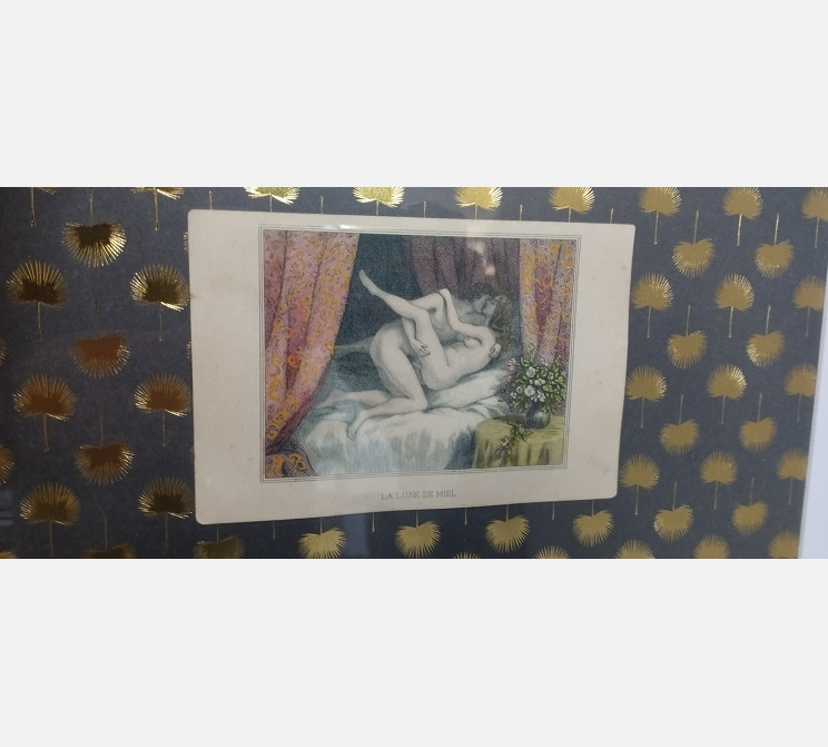Image érotique ancienne 'Lune de miel' dans cadre noir.