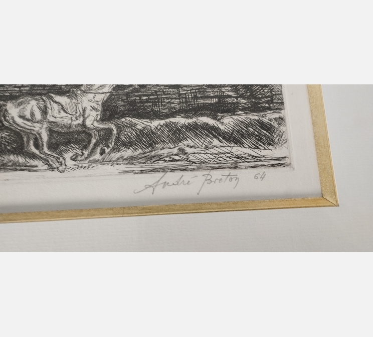 Litho numérotée d'un cheval au galop devant des maisons, signée André Breton