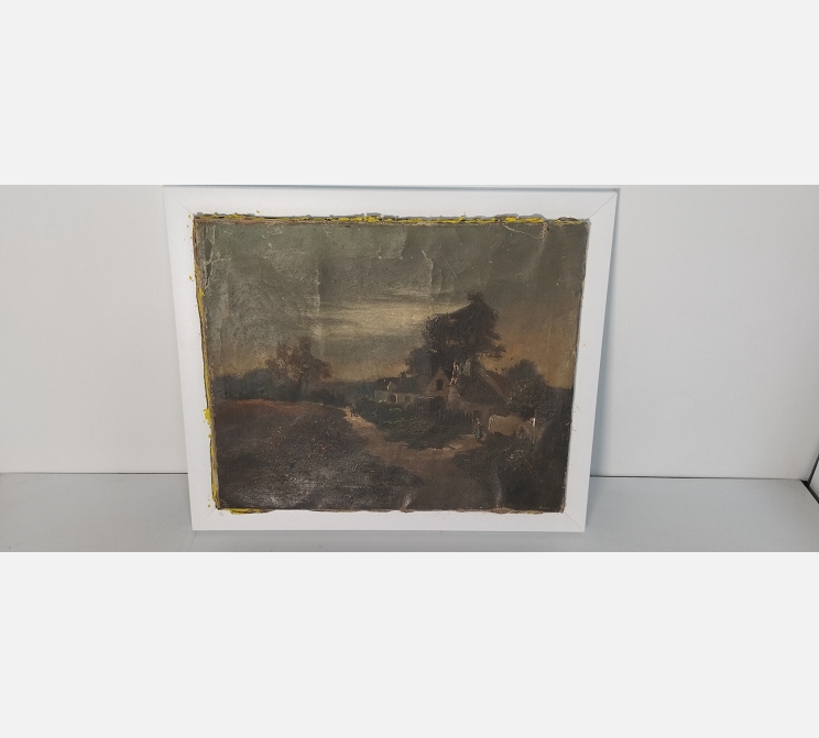 Peinture ancienne d'un paysage de campagne dans cadre blanc