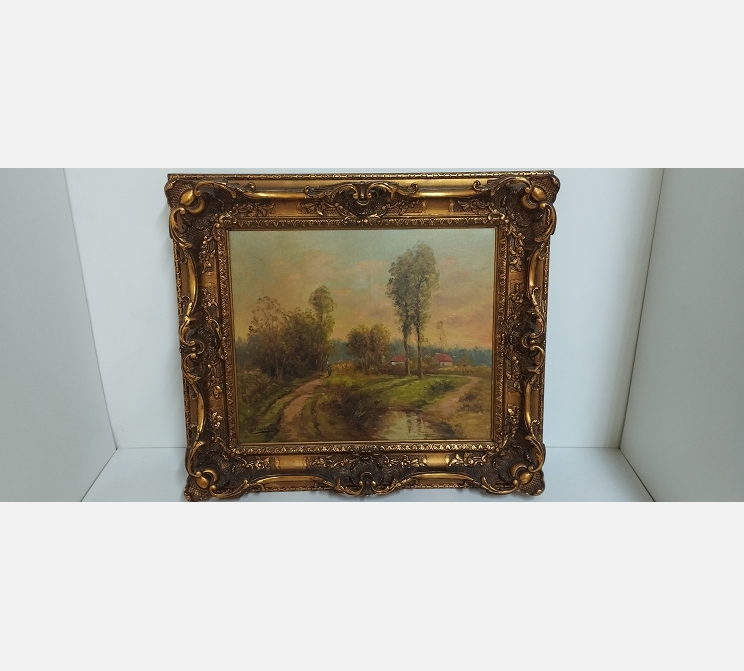 Peinture Chemin à la campagne signée Léonard dans un très beau cadre doré