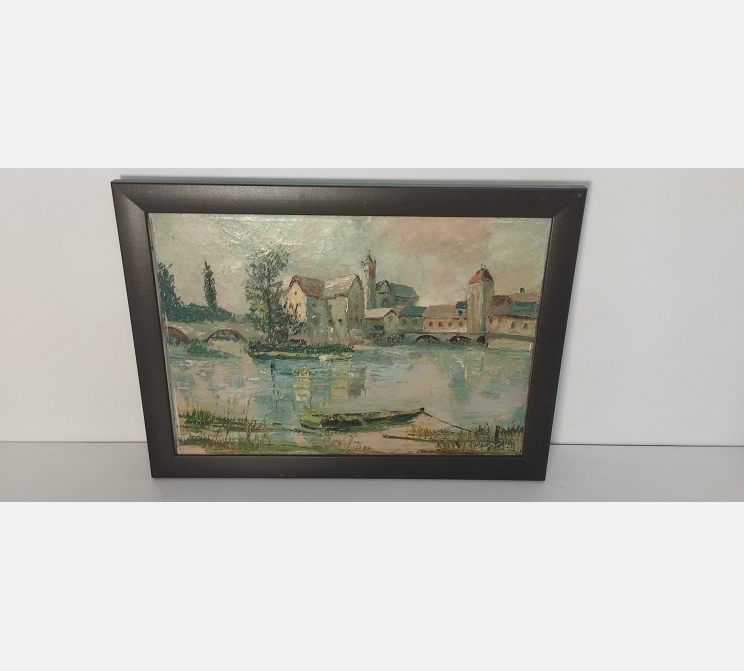 Peinture d'un village au bord de l'eau