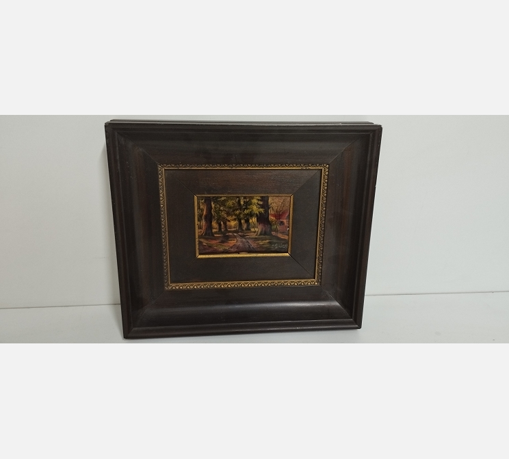 Peinture émaillée représentant un chemin en sous bois. Signé Jules Sarlandi