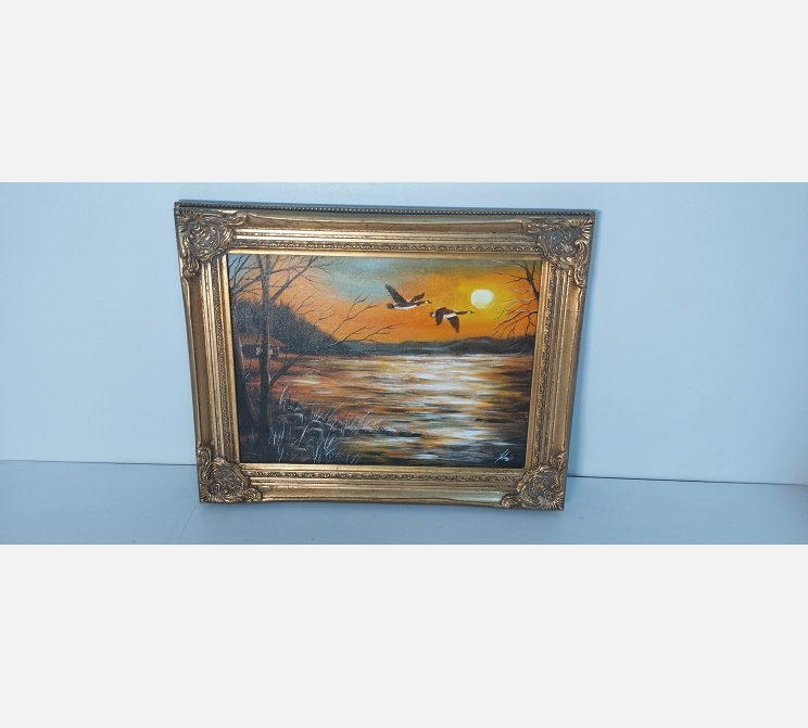 Peinture envole de canards sur soleil couchant dans cadre doré