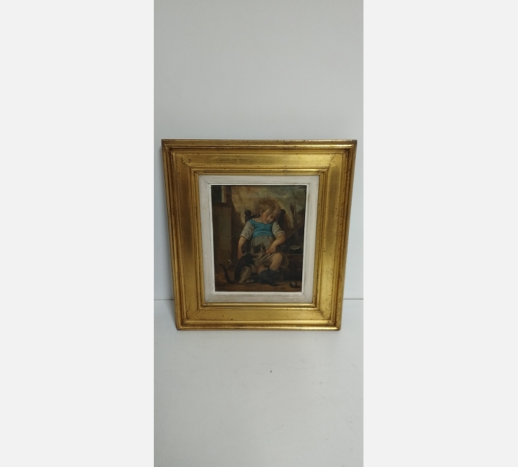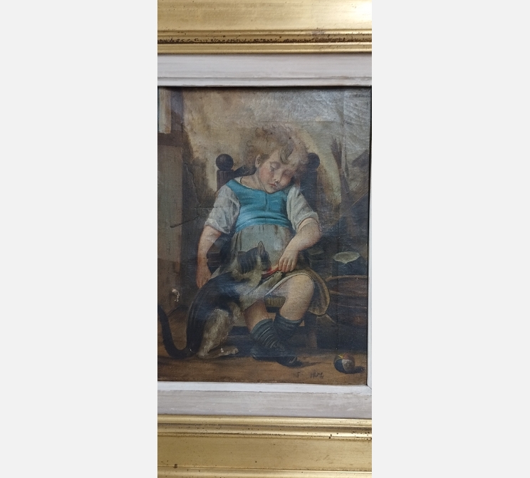 Peinture 'L'enfant dormant au chat voleur de pain' selon Léon Bazille Perrault.