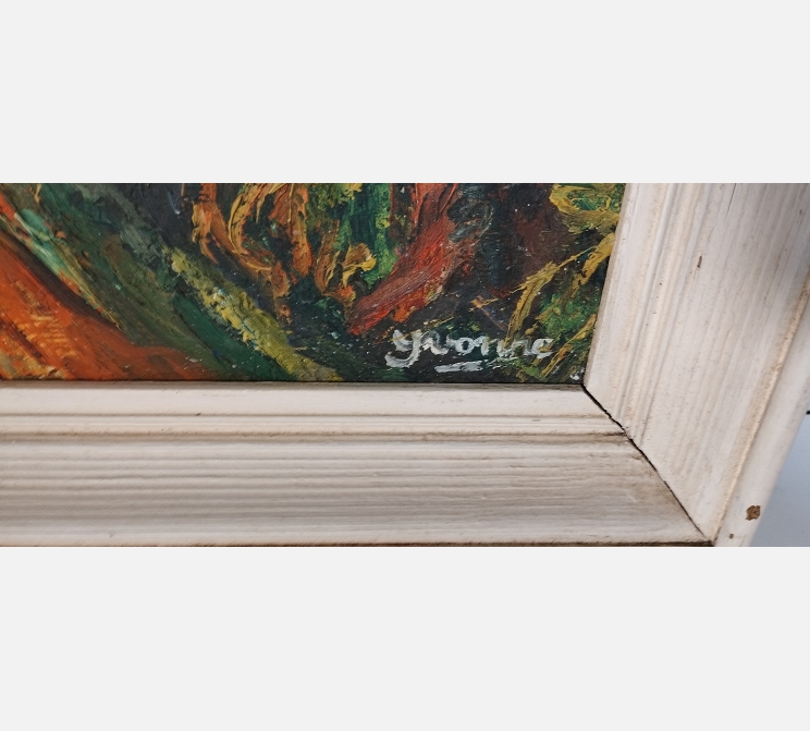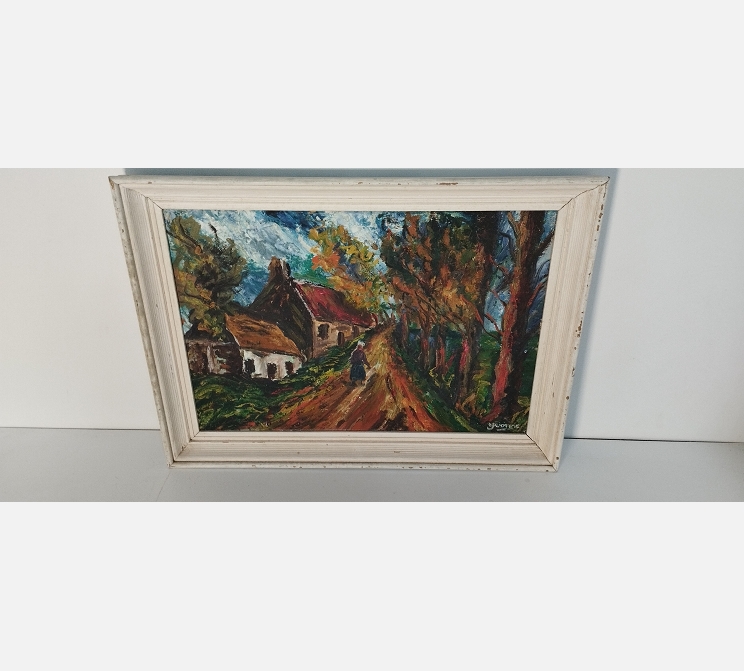 Peinture sur bois, personnage sur un chemin devant 2 maisons, signée Yvonne
