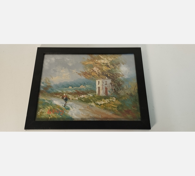 Peinture sur bois sous verre personnage sur le chemin, signée