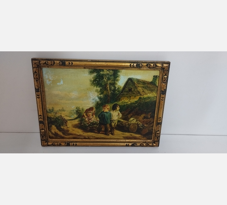 Petit tableau ancien d'enfants jouants devant une chaumière signé De Rick
