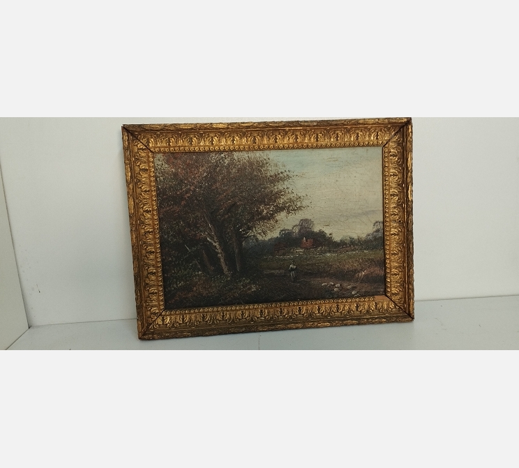 Petite peinture ancienne personne en lisière de forêt dans cadre doré