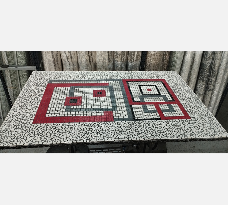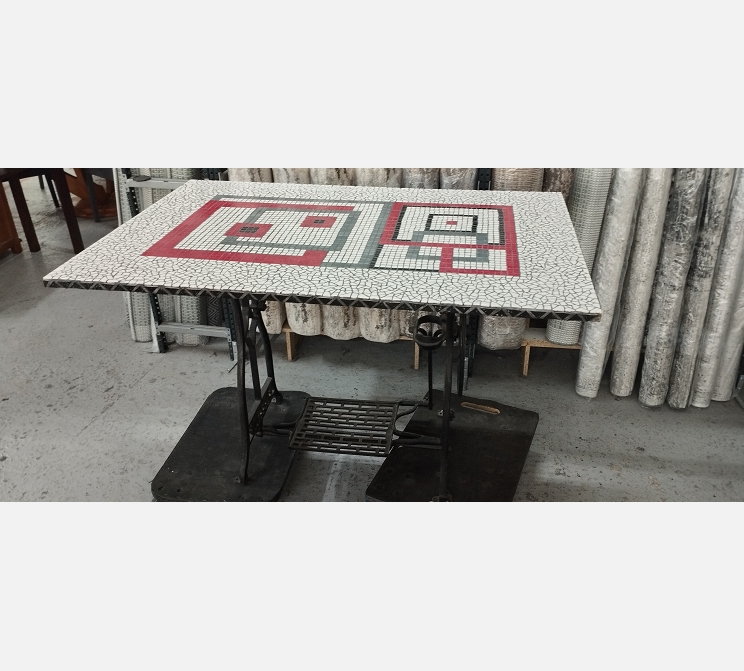 Table en mosaïque sur pied d'ancienne machine à coudre.