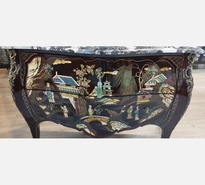 MAGNIFIQUE COMMODE STYLE ASIATIQUE FORME LOUIS XV EN LAQUE NOIRE ET DÉCO PAGODES