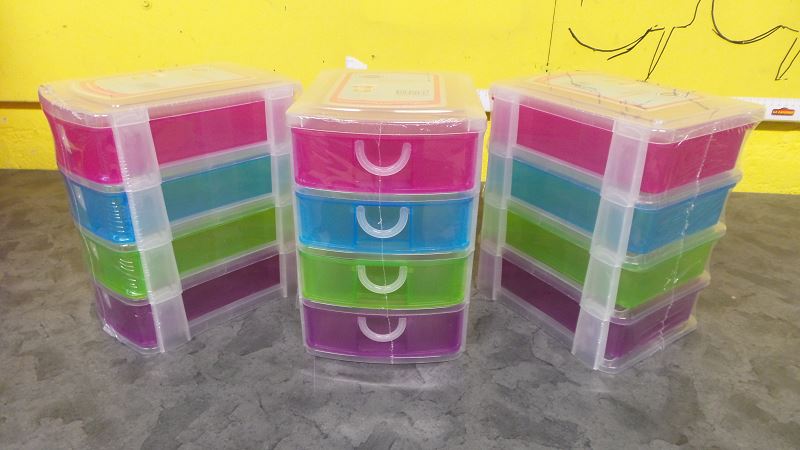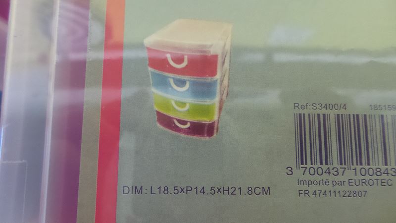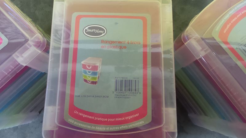 Rangement 4 tiroirs en plastique coloré. L 14.5 / P 18 / H 21,8 cm.