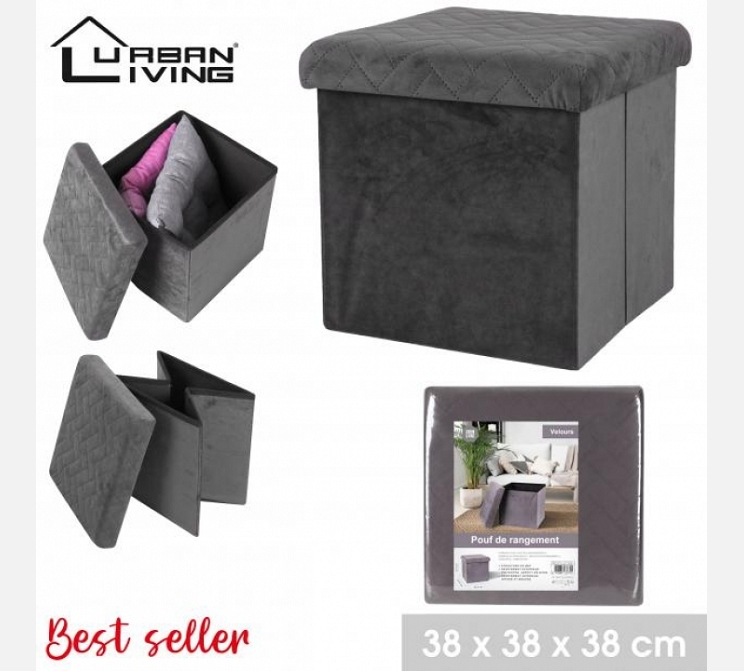 Pouf de rangement pliable KUBE en velours gris foncé.