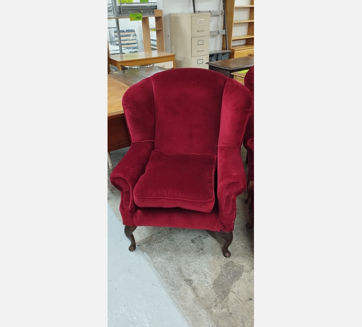 Ensemble en velours rouge de 2 fauteuils avec 1 repose pieds.