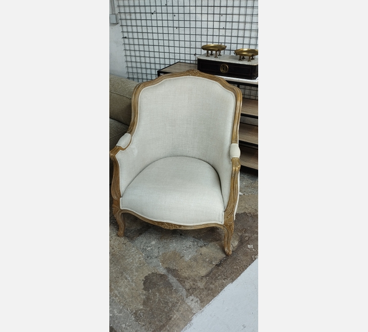 Fauteuil bergère en tissu écru.