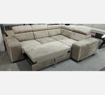 2A1KVB CANAPÉ D'ANGLE KAROLA CONVERTIBLE EN VELOURS BEIGE, TÊTIÈRES AMOVIBLES.