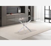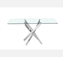 TABLE DE SALLE À MANGER LASI DESSUS VERRE ET PIEDS CROISÉES CHROMÉS.